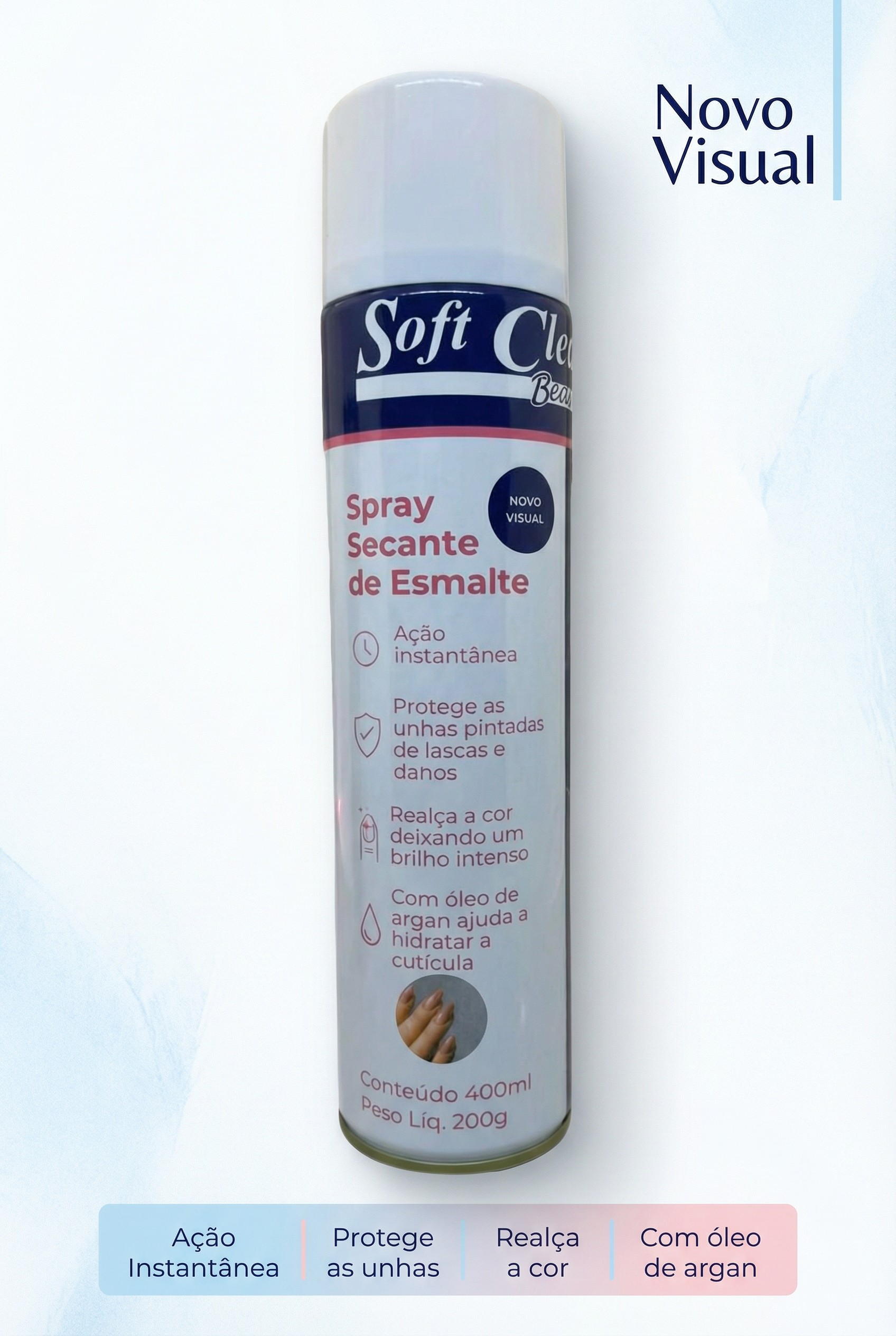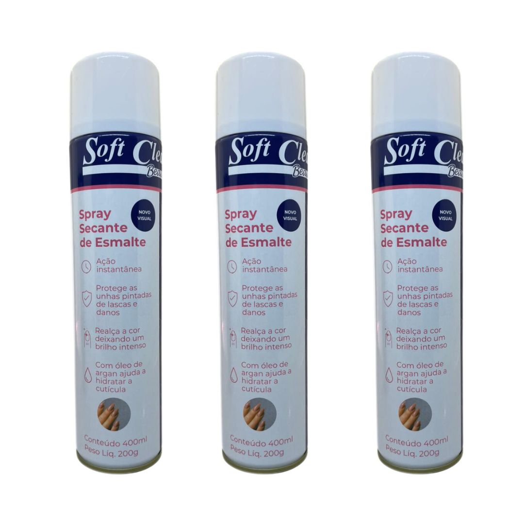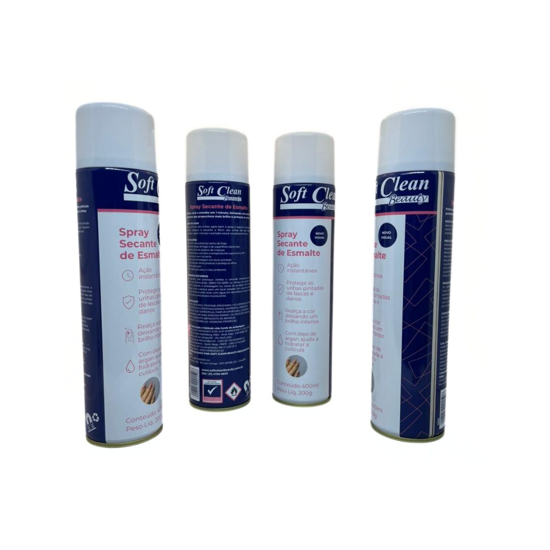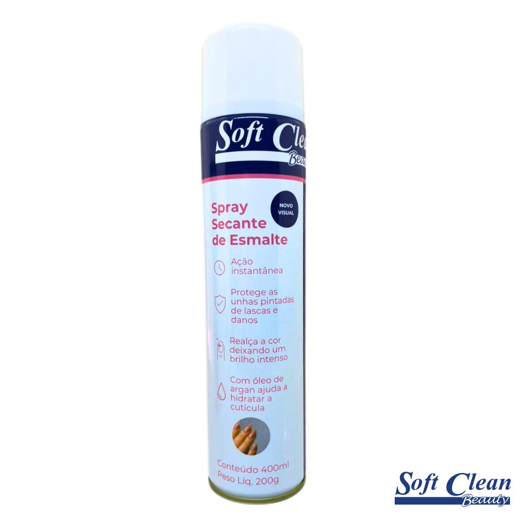 Secante de Esmalte - SOFT CLEAN 400ml, tem ação instantânea e protege as unhas pintadas de lascas e danos, realça a cor deixando um brilho intenso. Com óleo de Argan ajuda a hidratar a cutícula. *Secagem rápida *Brilho instântaneo *Proteção e hidratação *Não forma bolhas *Dermatologicamente testado INSTRUÇÕES DE USO: Agite bem antes de usar. Mantendo a embalagem na posição vertical, aplique o produto sobre as unhas pintadas a uma distância de aproximadamente 15 cm, em jatos suaves, de forma rápida e uniforme, para obter um melhor resultado.